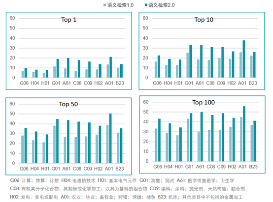 从以上测试结果图表可以看出,语义检索2.0在一些IPC分类上,相较于1.0有较为显著的提升,例如G01、A61、C08、C09、A01等,Top1可达6%以上的提升,Top100可达15%以上的提升,其他分类在Top1也至少有2%的效果提升,在Top100至少有5%以上的效果提升。使用语义检索2.0,有7个IPC分类在Top1的X文献检出率可达13%以上,最高可达21%,有8个IPC分类在Top100的检出率可达41%以上,最高可达56%。
