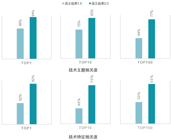 语义检索2.0相较于语义检索1.0版本在技术主题相关度与技术特征相关度方面都有比较明显的效果提升,技术主题相关度在Top1-Top100的范围有8-13%的效果提升,技术特征相关度在Top1-Top100的范围有20-25%的效果提升。技术主题在Top1有高达94%的相关度,在Top100仍有77%的相关度,这得益于语义检索2.0的算法对于技术主题的识别与强化等作用。而技术特征在Top1可以达到82%的相关度,在Top100可以达到55%的相关度,这得益于语义检索2.0的算法对于噪音的过滤等作用。